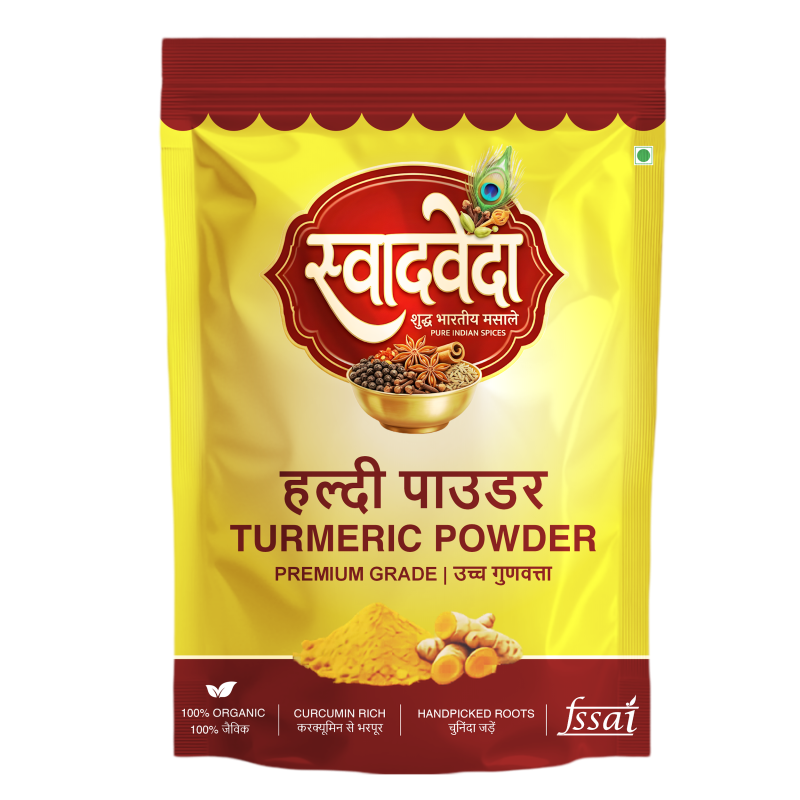 • swadveda Shudh Haldi ko behtareen gunvatta wali haldi ki gathon se taiyar kiya gaya hai. Isse machine ke bajaye paramparagat tarike se "Koot-kar" (Hand-Crushed) banaya jata hai, taaki iska asli peela rang, natural oils aur High Curcumin content barkarar rahe. Yeh sirf ek masala nahi, balki sehat aur immunity ka khazana hai.